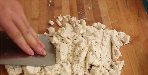 2、準備一塊豆腐,先把它切成薄片,再用菜刀給它直接碾碎,碾成豆腐泥,稍微用點力,豆腐碾碎後,把它放在一個大點的盤中。