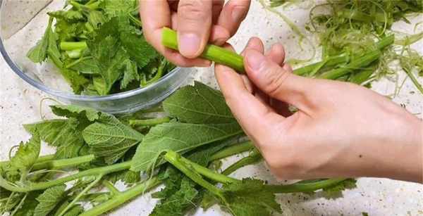 1、準備一把新鮮的南瓜苗,先把表面的筋膜撕幹凈,再掰成一段一段的,南瓜的葉子隨意的抓一下,去掉上面的小絨毛,處理好後放在盆裡面。