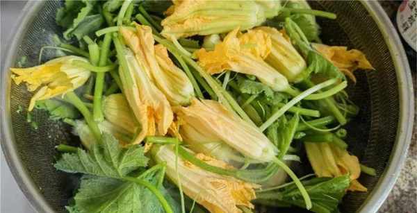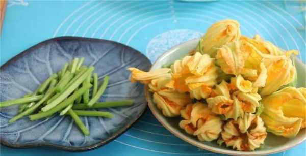 1、準備一把新鮮的南瓜花,先用清水給它沖洗兩遍,保留住花骨朵的完整,南瓜苗部分,記得把筋膜撕幹凈,然後分別裝在盤中備用。