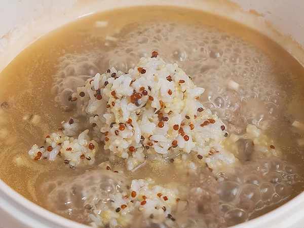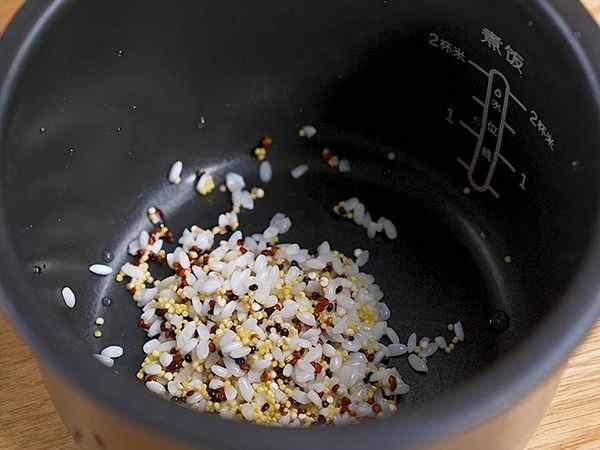 1、大米,小米和藜麥洗凈後放入電飯鍋,加150毫升清水煮成軟飯。(粗糧也可以直接選擇我們的一周米,粗細科學搭配更省心~)