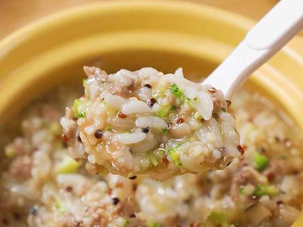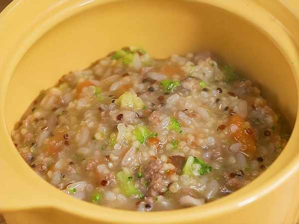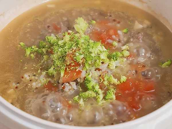 5、再加入蒸好的米飯,和西蘭花,番茄碎攪拌均勻。用小火慢慢熬煮,煮至濃稠即可出鍋。