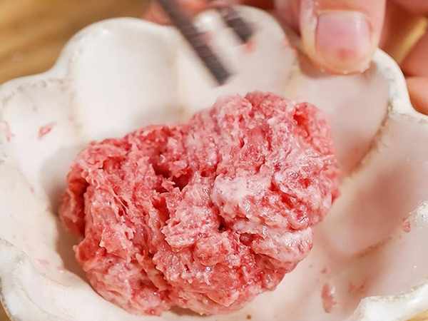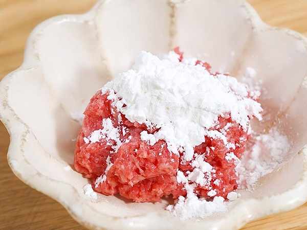 3、肉沫加少量淀粉攪拌均勻,這樣肉肉會更美哦。