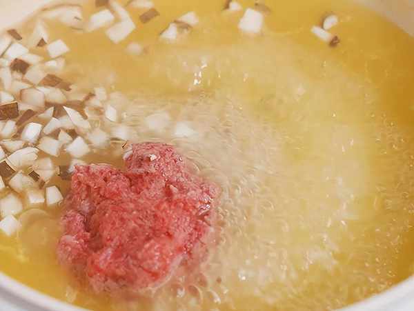 4、鍋中清高湯煮開後加入牛肉和香菇碎煮軟煮熟。