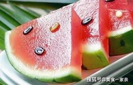 5,把西瓜汁倒入西瓜殼裡,放入冰箱冷藏3個小時左右後凝固即可,取出後切片即可食用。