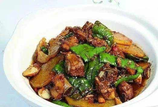 辣椒系列菜在長沙很常見,著名的有辣椒茄子、辣椒土豆根等。這道菜有兩個不同之處。一種是紅辣椒和烤排骨同時燉,葷素搭配,氣質鮮美;另一種是加入炸至外脆內糯的薯片。份量大,成本低。.