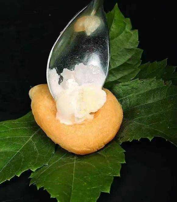 這道菜有兩大亮點:一是將炸糕的“老搭檔”糖換成冰淇淋,加熱冷卻後產生奇妙的化學反應,新奇美味;蛋糕做成水滴狀,壓成一個小空腔,然後塞入少許冰淇淋即可食用。吃起來很有趣,吸粉無數。