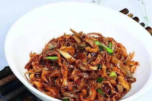 3、鍋內加入豬油50克、菜籽油50克,加熱至50%熱。大火炒鵝腸125克,加入羊耳菌絲50克,加蠔油10克,鹽、味精、生抽、生抽各5克,辣鮮露3克幹辣椒炒勻,出鍋前撒上15克蒜苗,炒勻即可食用。