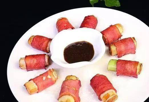 培根卷是用大蔥炒的,外咸內甜,配上黑胡椒醬吃起來很驚艷。