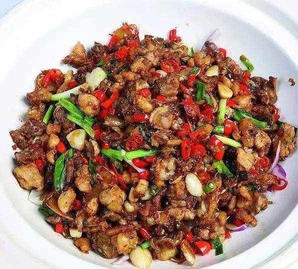 炒雞雜並不少見。幾乎每傢湖南菜館都有賣。這道菜受歡迎的最大秘訣是用生雞蛋(也叫陰雞蛋)炒雞蛋油來炸雞雜。香氣濃鬱,營養豐富。