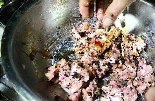1、取豬後腿200克,豬排100克切成細條,加雞蛋1個,黃酒50克,鹽20克,薑末15克,味精,雞精,五份-香料粉、胡椒粉抓少許面粉和白芝麻,醃制15分鐘,加入80克生粉繼續攪拌,邊抓邊倒少許水。