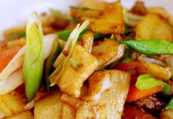 2、起鍋燒熱倒油,放入土豆片煸至表面發黃,倒入胡蘿卜片翻炒幾下盛出;