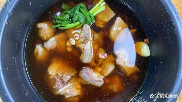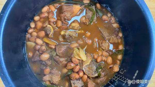 3、煮好的骨頭撈入電飯煲內,倒入適量的清水沒過骨頭,放入小蔥、2片生薑、1個八角、1個香葉、1勺甜面醬、少許醬油上色、1勺味極鮮和少許的鹽,最後把花豆倒進去,用勺子攪動一下,摁蒸飯鍵,燉煮1個小時。
