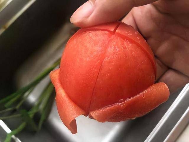 1.首先準備新鮮的西紅柿兩個從頂部切個十字花刀,然後把它放在開水中燙五分鐘。五分鐘後去掉外皮。切成厚的薄片最後再切成小丁。