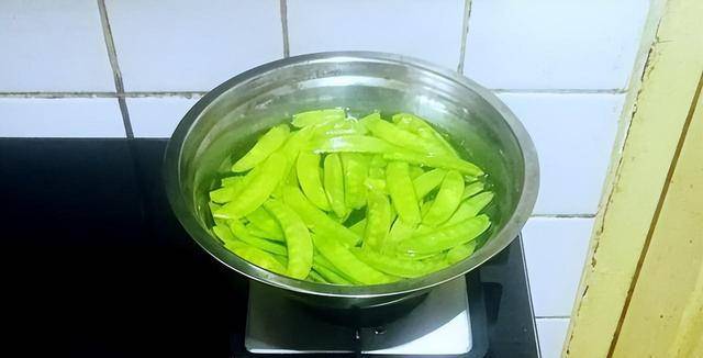 2.炒鍋燒熱放入適量的清水大火燒開。水燒開後把準備好的豌豆莢放入鍋內。用大火汆燙20秒後立即撈出。