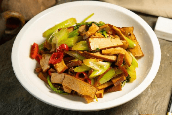 芹菜洗凈後切段,胡蘿卜切片,豆腐幹切成三角塊,大蒜切片。鍋中燒熱油,爆香蒜片後,放入豆腐幹翻炒,炒制一段時間後,再加上芹菜和胡蘿卜,然後用鹽、味精、醬油、蠔油調味,之後倒入少許清水,燜煮一會兒,可以更入味,大火收汁後開吃。