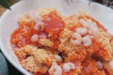 做法:①蝦仁洗凈後,用醃蝦仁料拌勻。瘦豬肉切絲拌勻醃料,醃置片刻。冬菇用溫水泡漲後,去蒂切成細絲備用。②在炒鍋內燒熟六湯匙油(約八成熟即可),先炒熟豬肉絲,隨即鏟出放在盤中,再燒熱鍋中剩馀之油,傾落蝦仁大火炒熟,盛在肉絲一起。③放下香菇絲在炒鍋內略炒,並註入清湯煮滾,然後加入蕃茄醬、醬油、糖、醋、鹽調味,待再滾煮後,即用調過水之濕太白粉勾芡,使汁粘稠,再將炒過之豬肉絲與蝦仁及熟青豆等加入攔勻,最後淋下少許麻油。改用小火繼續使其保暖(中太滾以免湯汁乾)。④將六杯油在另一隻鍋內燒得極熟之後,投入鍋巴用大火膨,至顏色變黃而酥脆時撈出(油不要瀝得太乾),裝在深盤(或大碗內),同蝦仁料(盛在另一隻碗中)一起迅速端上桌面,澆下蝦仁料到鍋巴上,當時必呈油爆之聲,即可迅速供食