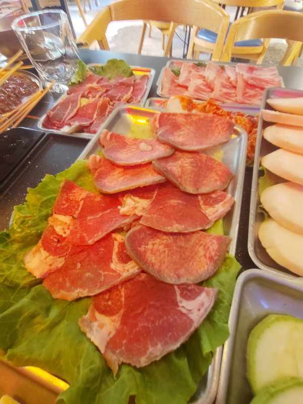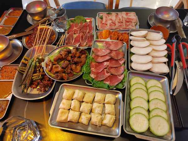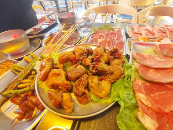 我們點瞭199元的4人豪華套餐,太超值瞭,5個人根本吃不完。它裡面有三份安格斯品質牛肉:黃牛肉薄荷蘸孜然、安格斯谷飼牛上腦原切 、安格斯牛肩原切,在石板上烤一烤變色即可享受,肉香滿滿。爆好吃的招牌葷菜有4個:香鹵烤雞 、碳烤鮮豬肝、鹵烤兔肚 、韭菜烤鴨腸,都是別處吃不到的特色燒烤。