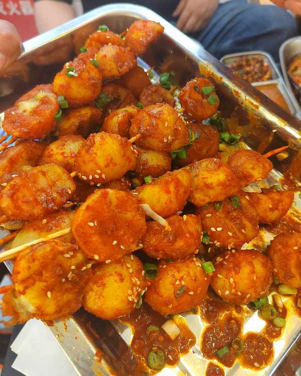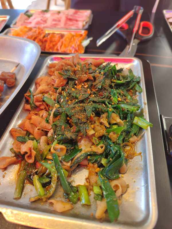 韭菜烤鴨腸,把重慶火鍋常用三大招牌之一的鴨腸,拿來與韭菜燒烤吃,鮮嫩脆爽,讓人回味悠長。套餐裡的烤雞竟然是一整隻雞,先鹵後烤,撕成小塊撒在烤石盤上,蘸上醃菜膏蘸水,一邊烤一邊吃,爽。