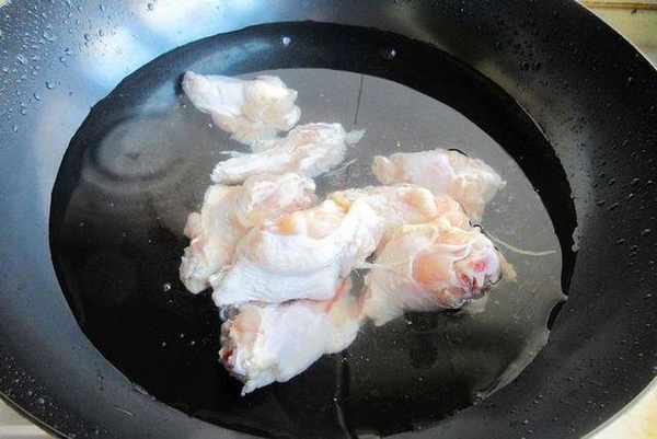2、把雞翅根洗凈,下到涼水裡煮開,去掉血沫,撈起來這樣可以去腥味,記住不要用開水焯雞翅根,那樣雞翅血水不易出來。