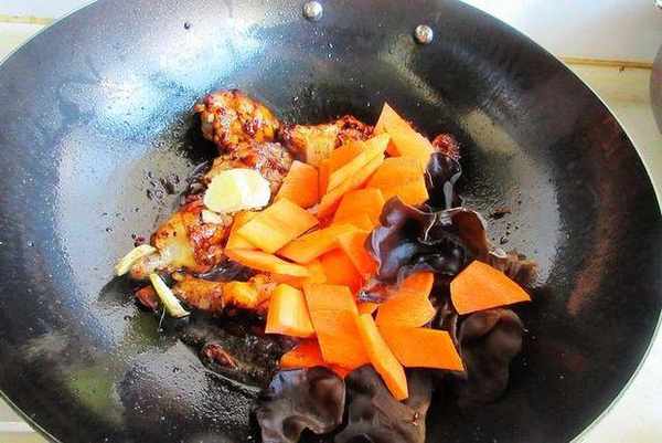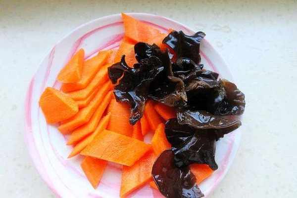 7、加胡蘿卜片和少許木耳翻炒均勻,(木耳可選)
