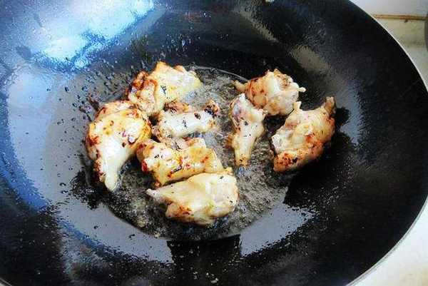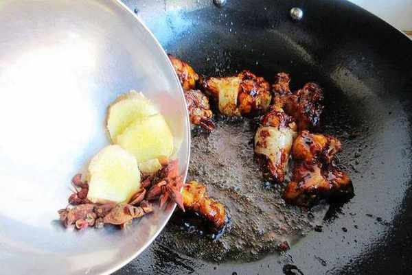 4、加雞翅根翻炒均勻,加料酒和老抽再次翻炒出雞翅根的香味以後