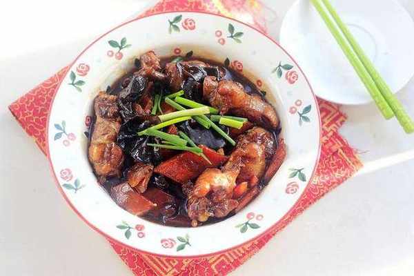 輔料:植物油有、鹽、甜面醬30克、紅燒醬油5克、薑10克、花椒粒2克、八角一個、泡發的木耳50克