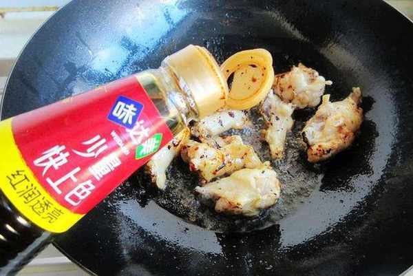 5、加料酒和老抽再次翻炒出雞翅根的香味以後