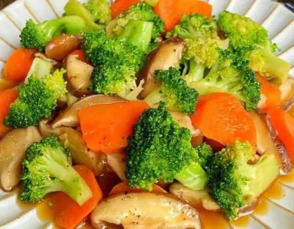 4.鍋中倒油,油熱後放入蒜片爆香,放香菇煸炒至軟,再加入胡蘿卜和西蘭花煸炒,加生抽、蠔油、食鹽、黑胡椒翻炒均勻即可出鍋。