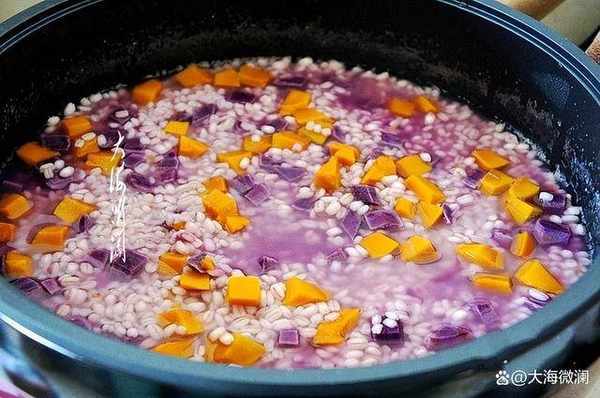 煎烤鍋加入適量的水,鍋水燒開水開加入青稞米,再次燒開溫度調至低溫,煮10分鐘左右,青稞米基本熟瞭加入紫薯和南瓜,繼續煮10分鐘。