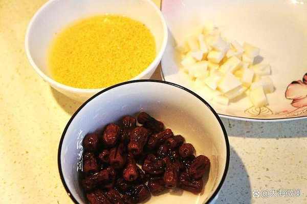 做法:山藥去皮洗凈切丁,無核蜜棗,需要提前浸泡10分鐘左右,略有漲發,然後再清洗幹凈,小米淘洗幹凈。