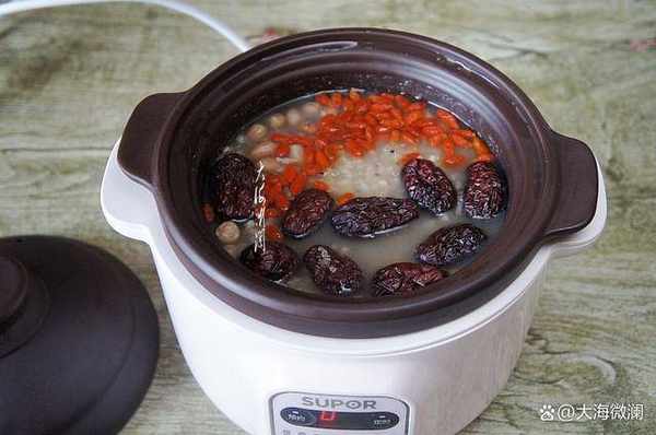 所有食材除瞭大棗、紅糖和枸杞子以外,全部加入到電燉鍋內。加入適量的水,設置雜糧粥,啟動電源,時間是4.3小時。