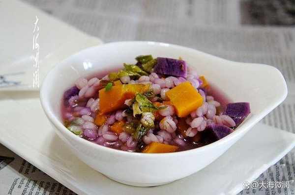 食材:青稞米、南瓜、紫薯、生菜、蔥、亞麻籽油、鹽、胡椒粉各適量。