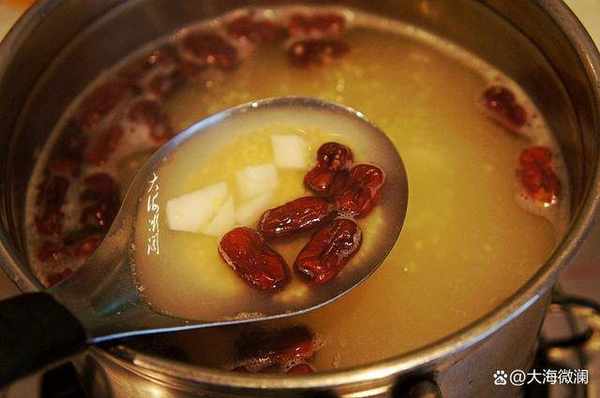 鍋中加入適量的水,放進金絲棗大火燒開,水開後下入淘洗幹凈的小米和山藥丁,用勺子攪拌均勻再大火燒開,轉小火慢慢煮,煮至黏稠。切記:小米一定要開水下鍋,不糊底不粘鍋。