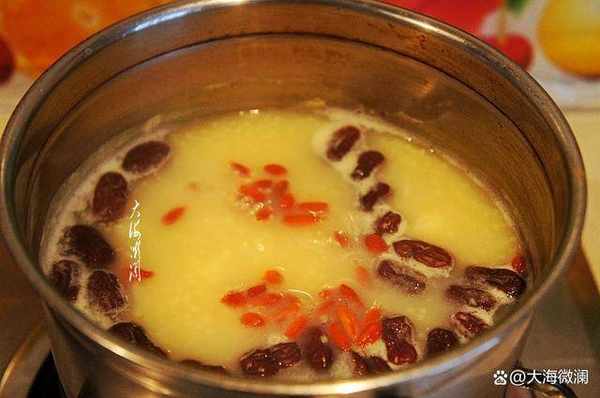 小米煮越黏稠,關火之前加入洗幹凈的枸杞子,再煮一分鐘即可關火,出鍋。