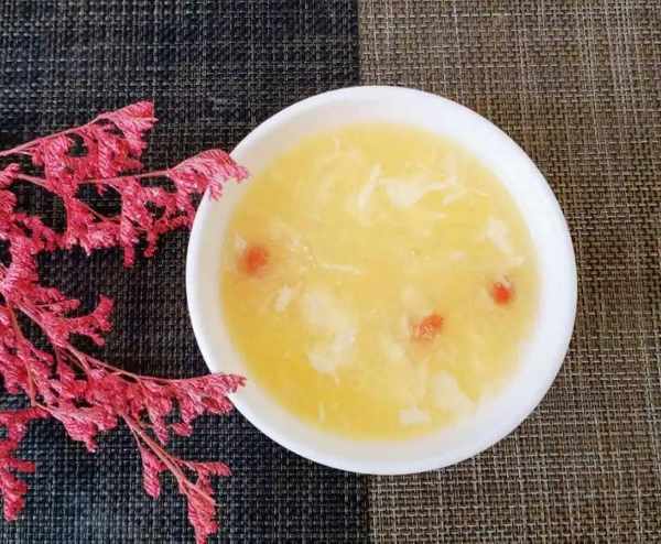 5、淋到玉米羹裡攪拌至濃稠,關火後加入打散的雞蛋,攪拌成蛋花狀;