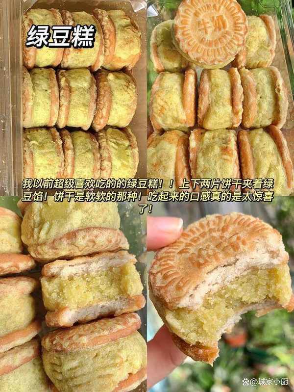 小時候超級喜歡吃的的綠豆糕,上下兩片餅幹夾著綠豆餡,餅幹是軟軟的那種,吃起來的口感很驚喜。