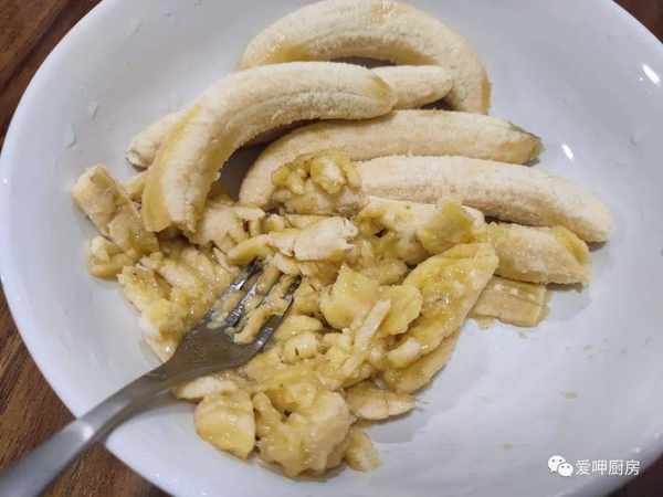 2.自然成熟的香蕉口感鮮甜好吃,營養特別好。脫皮的香蕉放在盆裡面,用叉子將香蕉搗成泥,搗成泥後放在一旁備用;