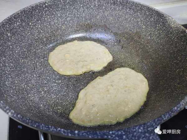 4.取出一個平底鍋,平底鍋預熱倒入油。接著我們往裡面放上適量的香蕉泥。香蕉泥下鍋後用鏟子輕輕地攤開,開小火慢慢地煎煮。