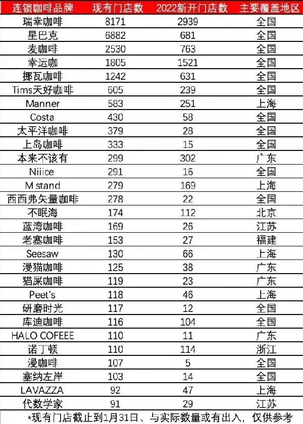 2023年1月,連鎖咖啡門店數量超過90傢的共有29傢,合計咖啡店數量25941傢,其中前10傢品牌合計22960傢,占總數25%。資本“史無前例”重註,2022年一年新增1.5萬傢。開業門店數量最多三傢為瑞幸(新開業2939傢)、幸運咖(新開業1521傢)、麥咖啡(新開業763傢)。外賣、直播、私域成為咖啡銷售的新三板斧:截至2023年3月1日,庫迪8.8元咖啡團購券已經賣出瞭313.9萬張;3月14日,幸運咖三款商品的優惠券購買數超過10萬;挪瓦咖啡抖音團購,兩款11.9元優惠券購買數也超過10萬。