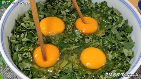 2.把紅薯葉放到菜板上,改刀把它切碎,切成小丁,切好之後放到幹凈的碗中。往裡面打入四個雞蛋,攪拌均勻,放一旁備用。