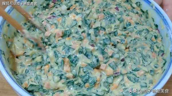 3.接下來切點胡蘿卜丁、火腿丁、洋蔥丁也放到大碗中,增加營養,再倒入半瓶牛奶,放入適量的鹽、味精,先攪拌均勻,然後倒入低筋面粉,把它調成厚厚的稠菜糊,