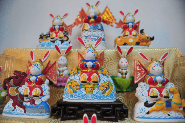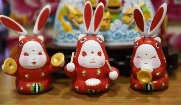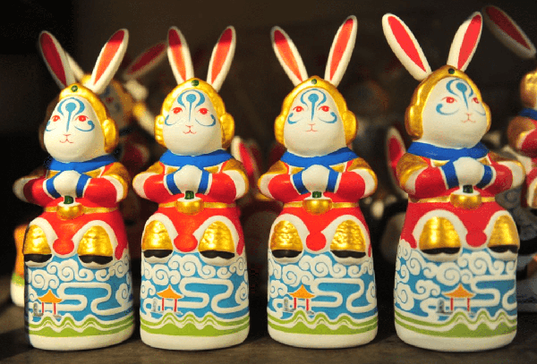 傳統泥塑兔子王白面紅唇、兔面人身,長長的耳朵與頭部之間用彈簧相連,有的身著紅袍、背插紅旗,有的手持藥杵穩坐虎騎之上,造型別致。