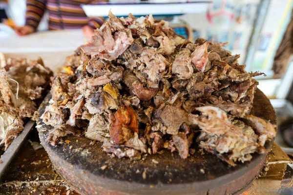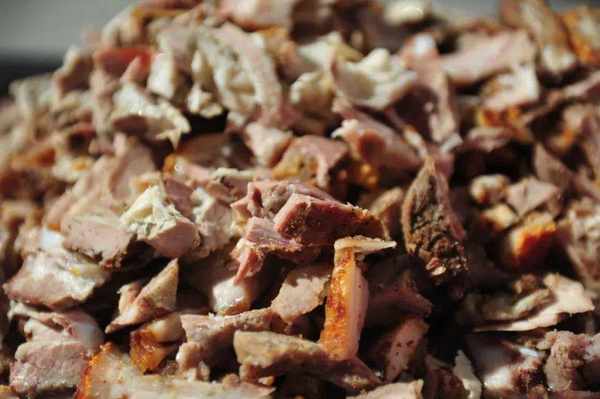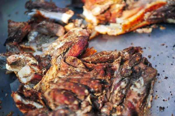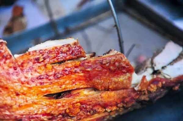 黃傢烤肉的做法也極其考究。選取200斤左右的大豬,遵循古法,經過剔骨、劃肉、醃制、支豬、牽眼、貼紙、燒爐等多道工序,吊掛在三米見方的土爐裡燜烤,出爐技藝講究全憑師傅經驗。