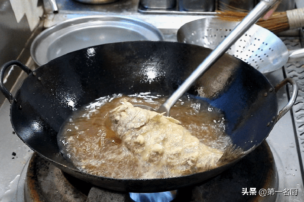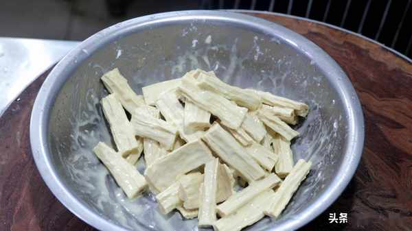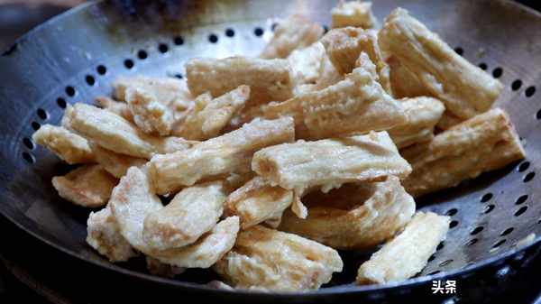 3.起鍋倒入食用油,油溫四成熱時下入拌好的腐竹,用漏勺輕輕翻動,避免腐竹粘連,炸至腐竹外皮金黃酥脆時,倒入漏勺中控油,這個過程大概要2分鐘。
