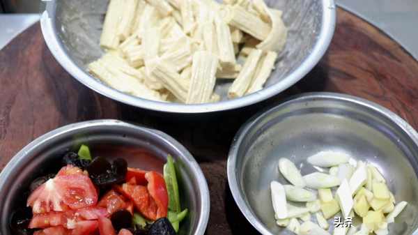 2.青椒一個去瓤切成三角片,紅椒半個同樣切成片,再放入一小把木耳,西紅柿半個切成片,一起放入小盆裡面,蒜子幾粒切成蒜片,大蔥半根切成斜片,生薑一塊切成薑片,一起放入盆中備用。