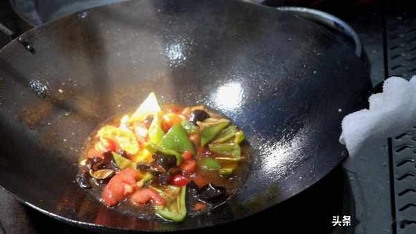 4.鍋內再添入少許食用油,倒入蔥薑蒜和紅幹椒爆香,加入蠔油3克,攪拌化開,加入番茄醬3克,倒入西紅柿,木耳和青紅椒,快速翻炒片刻。
