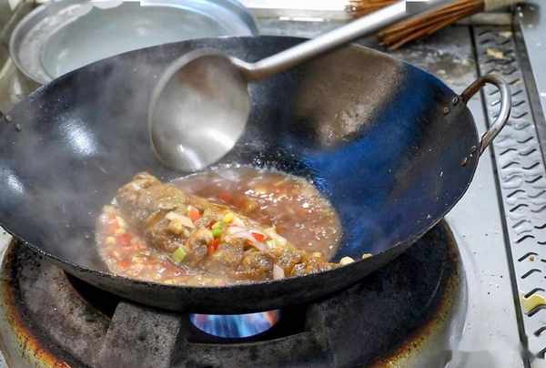 4.鍋中留少許底油,倒入切好的配菜炒香,倒入炸好的蒜片,添入適量清水,加入 食鹽2克,胡椒粉1克,味精1克,再加入老抽幾滴調色,加入料酒適量去腥, 蠔油3克提鮮,香辣醬3克,用勺子攪拌化開,放入炸好的鱸魚,用勺子把湯汁的澆到魚身上,使魚肉更加入味。
