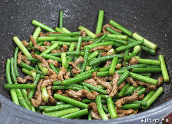 3、接著倒入蒜薹,繼續翻炒1-2分鐘,斷生之後,調味加少許的食鹽、生抽和雞精,再次翻炒均勻,就可以準備出鍋瞭,鮮香美味,下酒下飯,上桌一會兒就光盤。