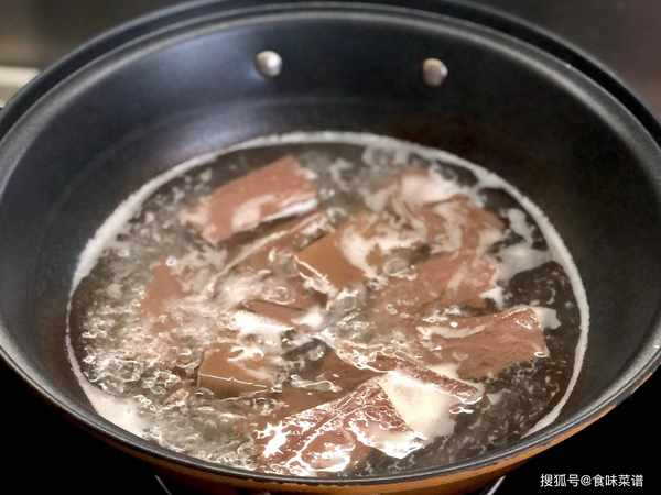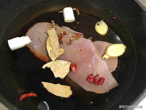 1、準備一塊新鮮的豬肝,放入盆中,浸泡2個小時,泡出血水,接著涼水下鍋,放入八角、桂皮、香葉、花椒、蔥薑等大料,大火煮15分鐘,關火再燜5分鐘。