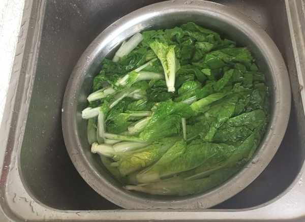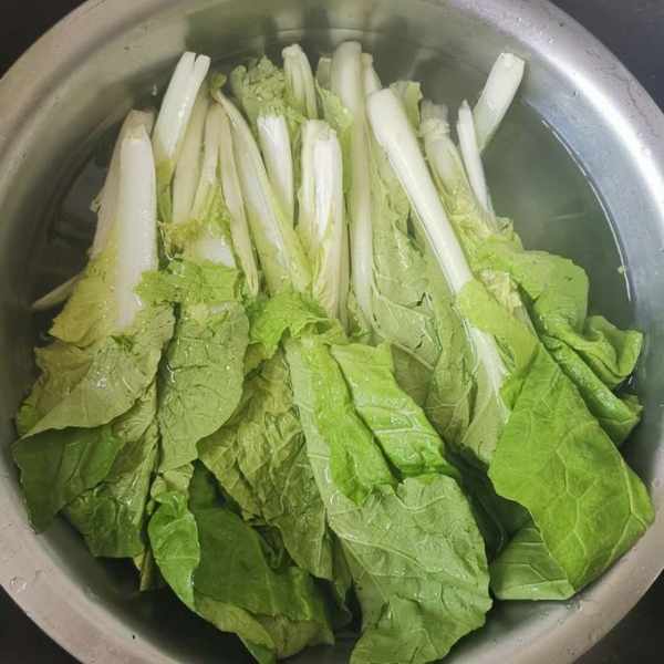 第一步:小白菜摘去雜質,清洗乾淨,浸泡大約10分鐘。小白菜中含有的各類維他命,比如維他命c,維生素b1等等,都是特別豐富的,能滋補身體,平時多吃很有好處。